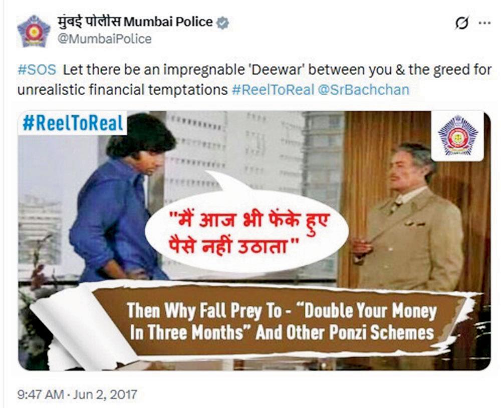 અમિતાભ બચ્ચને પણ મુંબઈ પોલીસની વર્ષ ૨૦૧૭ની એક પોસ્ટ શૅર કરી, જેમાં તેમની ફિલ્મ ‘દીવાર’નું પોસ્ટર છે. સાથે તેમણે લખ્યું કે ‘આજે અમે ખૂબ ખુશ છીએ. મુંબઈ પોલીસ અને મુંબઈ પોલીસ કમિશનરે સોશ્યલ મીડિયા પર ૧૦ ગૌરવશાળી વર્ષ પૂર્ણ કર્યાં છે અને મુંબઈવાસીઓની ઑનલાઇન સુરક્ષા માટે હંમેશાં તૈયાર છે. સંસ્કૃતમાં ‘સદ્રક્ષણાય ખલનિગ્રહણાય’નો અર્થ થાય છે ‘સારા કામની રક્ષા કરવી અને બુરાઈને રોકવી’. આ નાગરિકોની સુરક્ષા અને ગુનાઓ સામે તેમની પ્રતિબદ્ધતા દર્શાવે છે.’
