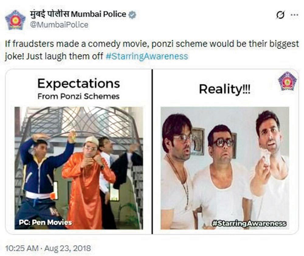 અક્ષય કુમારે મુંબઈ પોલીસની ૨૦૧૮ની એક પોસ્ટ શૅર કરી છે, જેમાં ફિલ્મ ‘હેરા ફેરી’ના સ્ટિલ્સ છે. તેણે લખ્યું, ‘છેતરામણી સ્કીમથી કેવી રીતે બચવું એ તો જણાવવું જ પડેને? મુંબઈ પોલીસ અને મુંબઈ પોલીસના કમિશનરને સલામ, જેઓ હંમેશાં અમારી રક્ષા કરે છે. અમારી સુરક્ષા માટે અમે તમારા ખૂબ આભારી છીએ.’