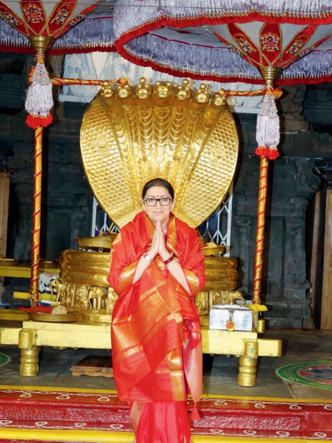 ઍક્ટ્રેસ અને રાજકારણી સ્મૃતિ ઈરાનીએ હાલમાં તિરુપતિ જઈને ભગવાન શ્રી વેન્કટેશ્વરનાં દર્શન કરીને તેમના આશીર્વાદ માટે પ્રાર્થના કરી હતી. સ્મૃતિએ પોતાના સોશ્યલ મીડિયા અકાઉન્ટમાં આ દર્શનની જે તસવીર શૅર કરી છે એમાં તેમણે પરંપરાગત સાડી પહેરી છે અને ભક્તિપૂર્વક હાથ જોડ્યા છે. આ તસવીર સાથે સ્મૃતિએ કૅપ્શન લખી છે, ‘તિરુપતિ બાલાજીનાં ચરણોમાં...’