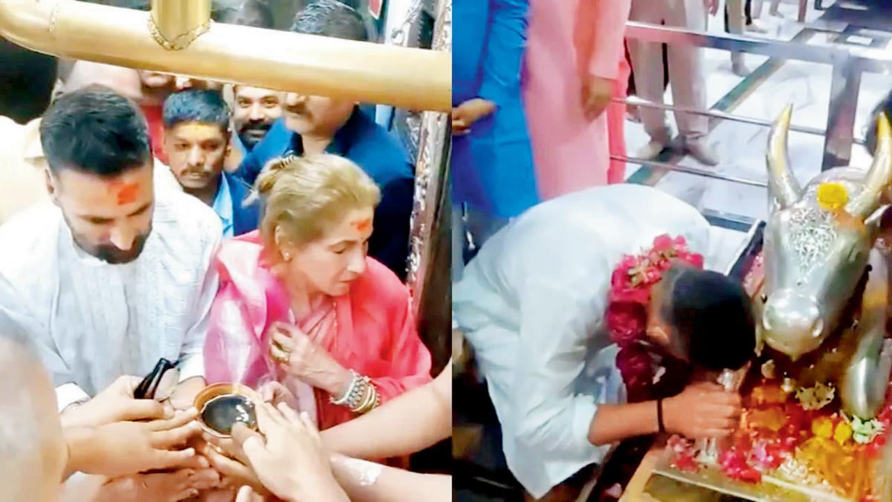 અક્ષય કુમાર ગઈ કાલે પોતાનાં સાસુ અને ઍક્ટ્રેસ ડિમ્પલ કાપડિયા સાથે ઉજ્જૈનના મહાકાલેશ્વર મંદિરમાં દર્શન કરવા પહોંચ્યો હતો. અક્ષયે પોતાની આવનારી ફિલ્મ ‘ભૂત બંગલા’ની રિલીઝ પહેલાં આશીર્વાદ લેવા માટે ભગવાન શિવ અને નંદીની વિશેષ પૂજા-અર્ચના કરી હતી. આ સમયે અક્ષયે સફેદ કુરતો-પાયજામો પહેર્યો હતો જે તેની સાદગી અને શ્રદ્ધાને દર્શાવે છે. મંદિર પરિસરથી બહાર નીકળતી વખતે મીડિયા સાથે વાતચીત દરમ્યાન અક્ષય કુમારે પોતાના આ આધ્યાત્મિક પ્રવાસનો અનુભવ શૅર કર્યો હતો. તેણે જણાવ્યું હતું કે ભગવાનનાં દર્શન કરવાથી તેને ઘણો આનંદ થયો. અક્ષયે કહ્યું, ‘મેં સમગ્ર દેશની સમૃદ્ધિ અને મારા પરિવારની ભલાઈ માટે પ્રાર્થના કરી છે. મેં માગ્યું છે કે આપણો દેશ હંમેશાં પ્રગતિના માર્ગ પર આગળ વધતો રહે અને વિશ્વમાં પોતાની અલગ ઓળખ બનાવે.’