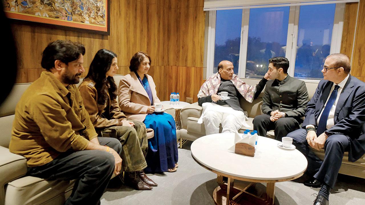 ‘ઇક્કીસ’ના કલાકારો જયદીપ અહલાવત, સિમર ભાટિયા, અગસ્ત્ય નંદા અને અગસ્ત્ય નંદાના પિતા નિખિલ નંદાની સાથે રક્ષાપ્રધાન રાજનાથ સિંહ