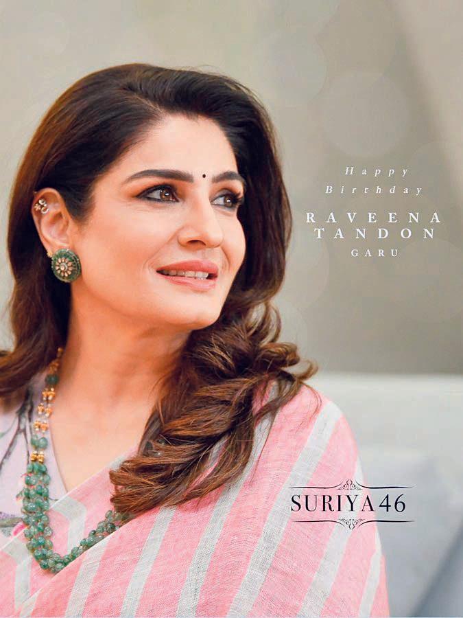 સાઉથના સુપરસ્ટાર સૂર્યાની આગામી ફિલ્મ ‘સૂર્યા 46’માં રવીના ટંડનની એન્ટ્રી થઈ છે. આ વાતની સત્તાવાર માહિતી આપતાં મેકર્સે રવીનાનું સ્વાગત કર્યું છે અને તેને જન્મદિવસની શુભેચ્છાઓ આપી છે. રવિવારે રવીનાનો જન્મદિવસ હતો ત્યારે ફિલ્મના મેકર્સ તરફથી સોશ્યલ મીડિયા પર રવીનાને જન્મદિવસની શુભેચ્છાઓ આપવામાં આવી તેમ જ ફિલ્મમાં તેનું સ્વાગત કરવામાં આવ્યું. મેકર્સે રવીનાની એક તસવીર સાથે ‘હૅપી બર્થ-ડે’ લખેલું એક પોસ્ટર શૅર કર્યું અને કૅપ્શન લખી કે ‘ટીમ ‘સૂર્યા 46’ તરફથી સદાબહાર રવીના ટંડનને જન્મદિવસની હાર્દિક શુભેચ્છાઓ. ટીમમાં તમને મળીને ખૂબ ખુશી થઈ અને આગામી શાનદાર સફરની રાહ જોઈ રહ્યા છીએ.’
