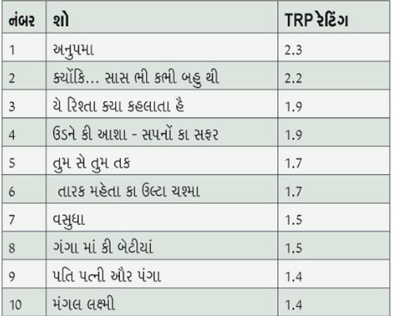 બ્રૉડકાસ્ટ ઑડિયન્સ રિસર્ચ કાઉન્સિલ (BARC)એ હાલમાં જે ટેલિવિઝન રેટિંગ પૉઇન્ટ (TRP) રિપોર્ટ જાહેર કર્યો છે એમાં આ વખતે પણ ગયા વખતની જેમ જ ‘અનુપમા’ ટૉપ TRP ધરાવતો શો છે અને એનો TRP 2.3 છે. એ પછી બીજા નંબરે ‘ક્યોંકિ... સાસ ભી કભી બહૂ થી 2’ છે અને એના TRP 2.2 છે.