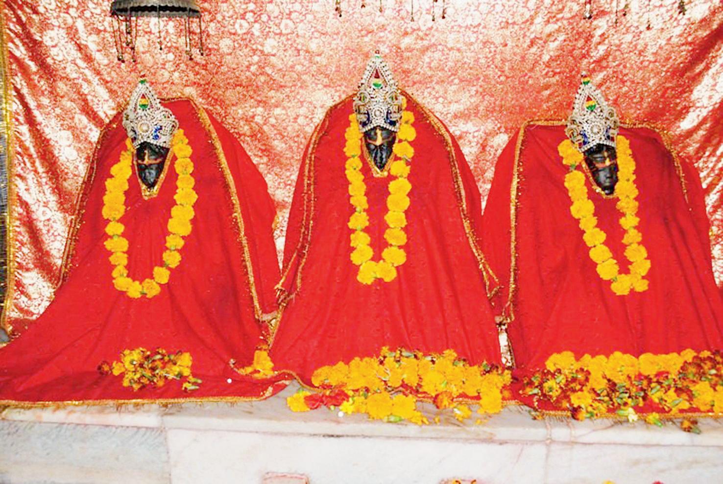 મંદિરમાં બ્રહ્મા, વિષ્ણુ અને મહેશની મૂર્તિ બિરાજમાન છે.