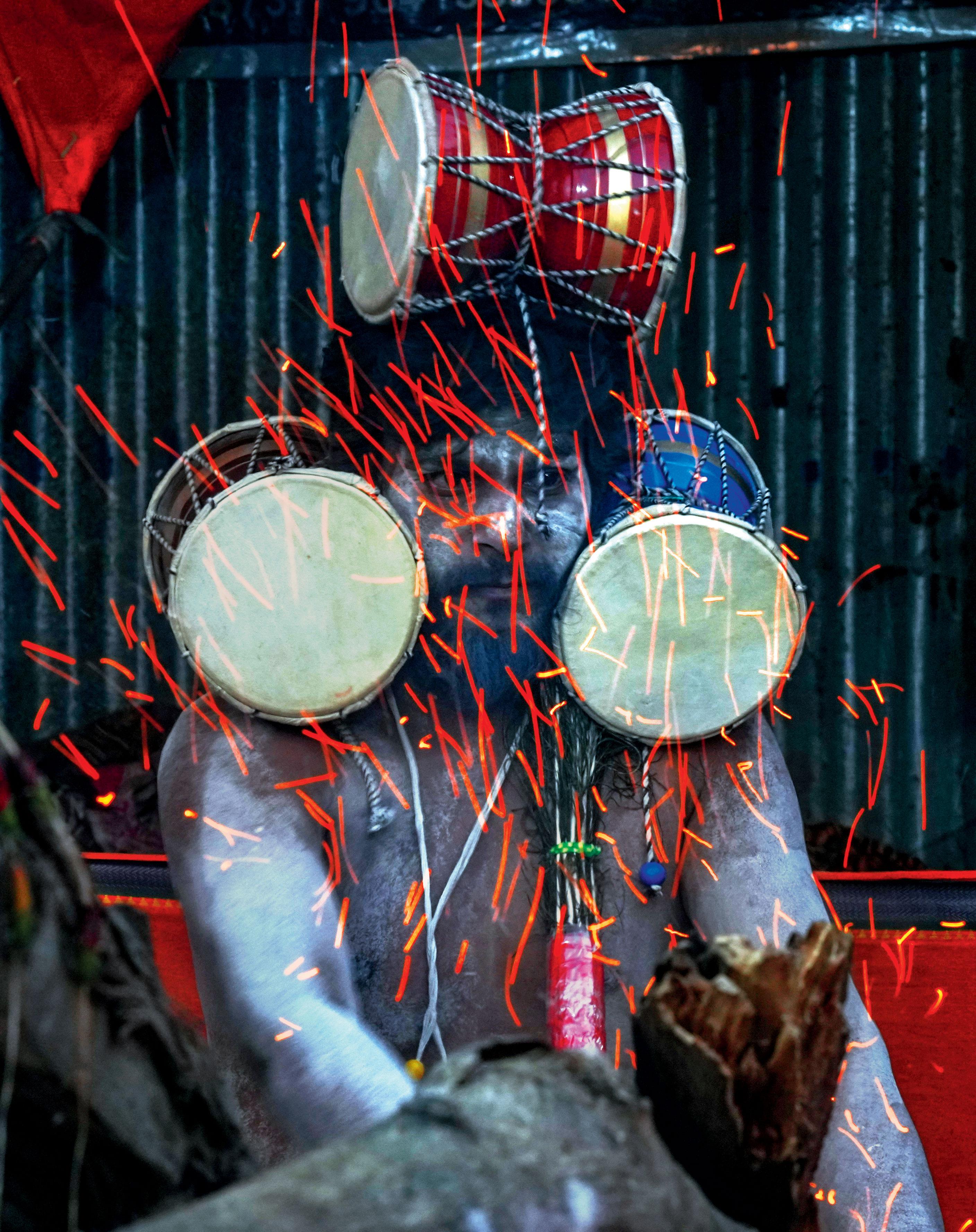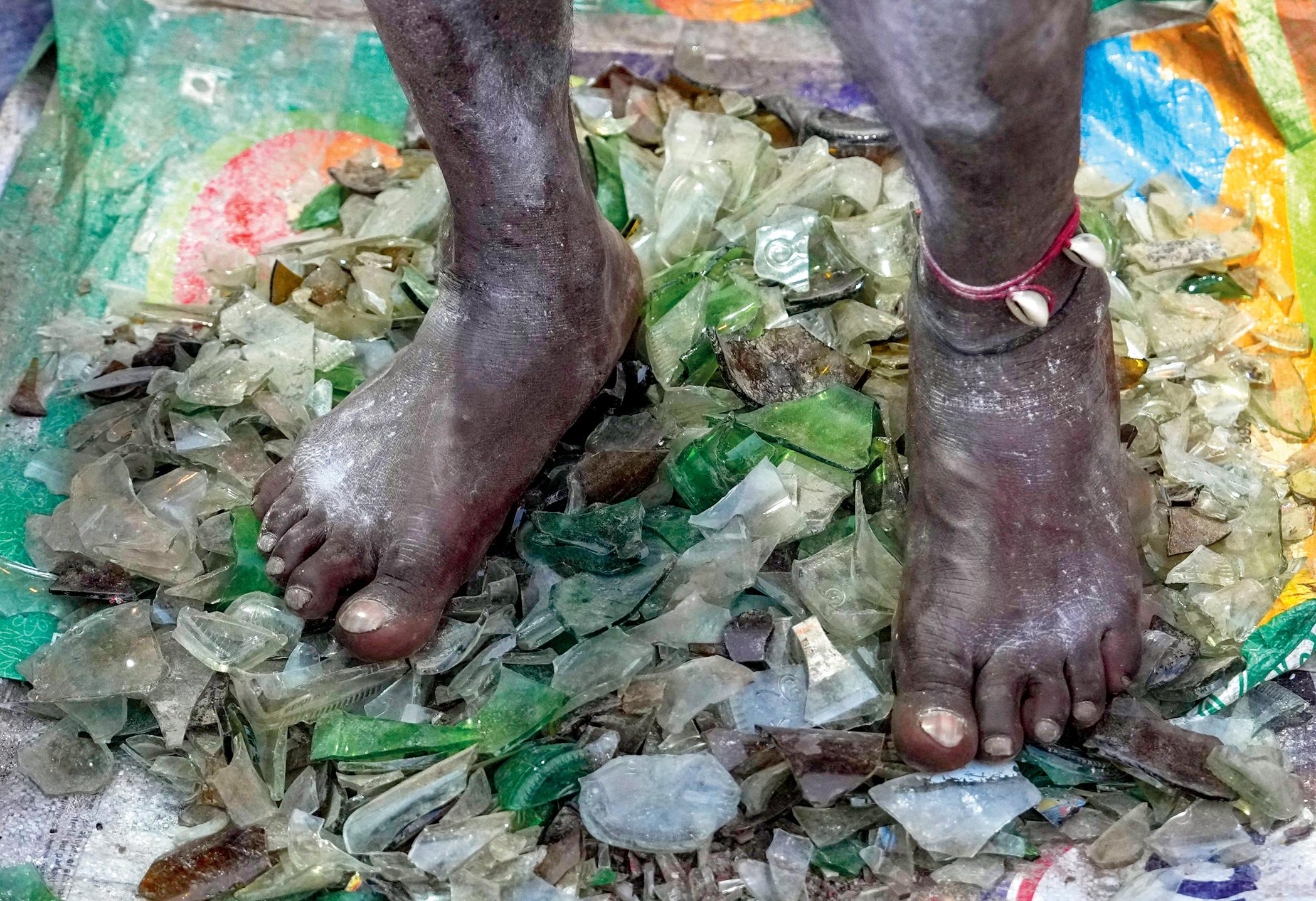 ગંગાસાગર મેળામાં કાચના ટુકડા પર ઊભા રહીને સાધના કરી રહેલા સાધુ.