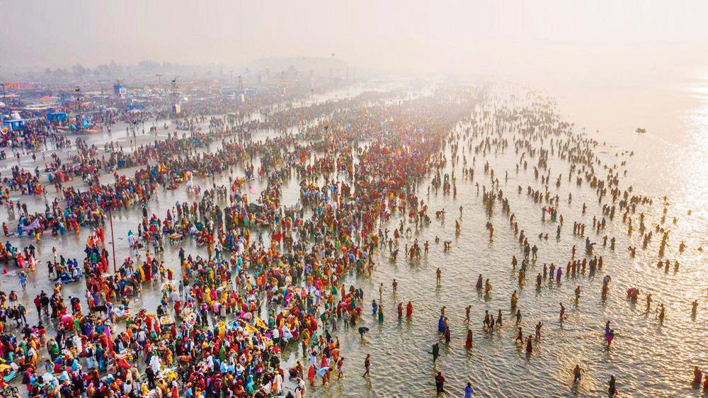 ગંગા નદી અને સાગરના સંગમસ્થાને ડૂબકી લગાવતા શ્રદ્ધાળુઓ.