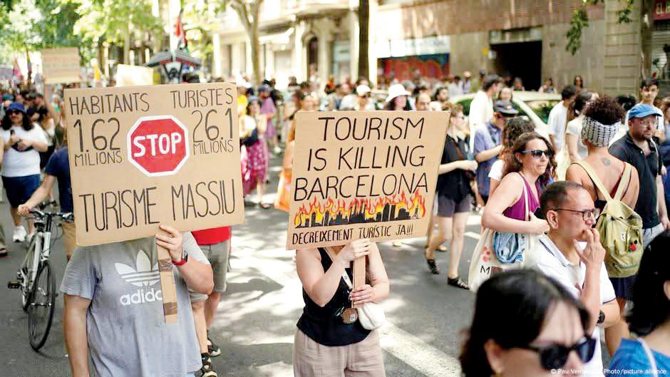સ્પેનના બાર્સેલોનામાં ગુસ્સે ભરાયેલા શહેરવાસીઓએ બૅનર અને પાણી ભરેલી પિચકારીથી પર્યટકોને પલાળીને વિરોધ દર્શાવ્યો હતો.