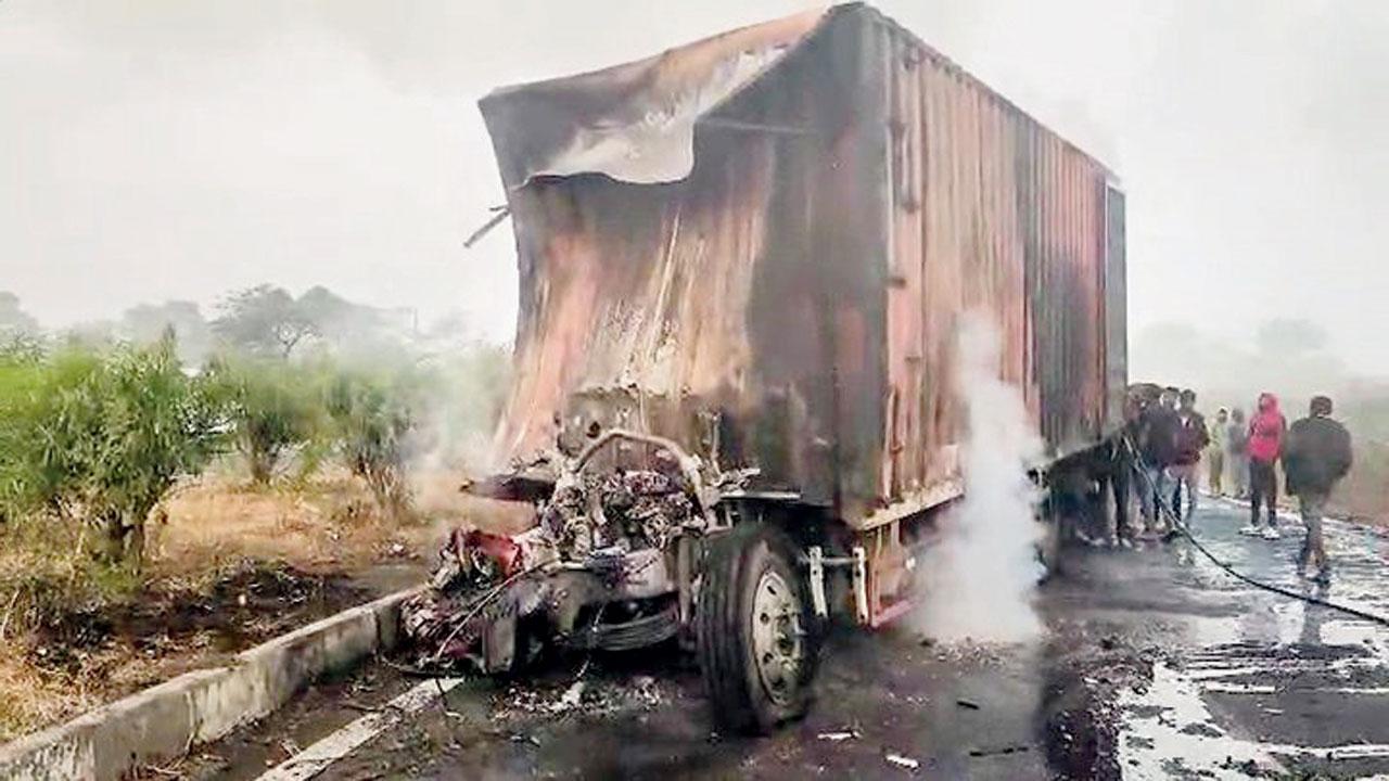 પંચમહાલ જિલ્લાના ગોધરા તાલુકામાં શુક્રવારે વહેલી સવારે કાળજું કંપાવી દે એવી દુર્ઘટના થઈ હતી. ગોધરા પાસે એક ટ્રક રૉન્ગ-સાઇડથી પૂરઝડપે જઈ રહી હતી અને તેણે સામેથી આવતી બીજી ટ્રકને જોરદાર ટક્કર મારી હતી. આ ટક્કર એટલી ભયાનક હતી કે બન્ને ટ્રકની કૅબિનના આગળના ભાગનો કચ્ચરઘાણ નીકળી ગયો હતો. જોકે અકસ્માત થયાની ગણતરીની મિનિટોમાં જ ટ્રકમાં શૉર્ટ-સર્કિટ થવાથી ભીષણ આગ ફાટી નીકળી હતી. એમાં કૅબિનમાં ફસાયેલો માણસ બહાર નીકળી શક્યો નહોતો અને જીવતો ભૂંજાયો હતો.