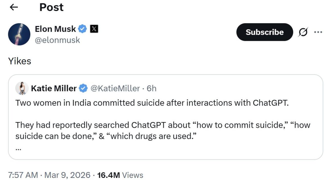 પોડકાસ્ટર અને ભૂતપૂર્વ ડિપાર્ટમેન્ટ ઑફ ગવર્નમેન્ટ એફિશિયન્સી સલાહકાર કેટી મિલરે X પર સમાચાર શૅર કર્યા પછી આ કેસ વૈશ્વિક સ્તરે ધ્યાન મળ્યું. તેમણે લખ્યું, "ભારતમાં બે યુવતીઓએ ChatGPT સાથે વાતચીત કર્યા પછી આત્મહત્યા કરી. તેઓએ ChatGPT પર `આત્મહત્યા કેવી રીતે કરવી,` `આત્મહત્યા કેવી રીતે કરી શકાય` અને `કયા ડ્રગ્સનો ઉપયોગ થાય છે` વિશે શોધ કરી હોવાનું કહેવાય છે. કૃપા કરીને તમારા પ્રિયજનોને ChatGPT નો ઉપયોગ કરવા દો નહીં." ઈલૉન મસ્કે તે પોસ્ટ પર એક શબ્દના જવાબ સાથે પ્રતિક્રિયા આપી: "અરેરે." મસ્કે ઓપનએઆઈના સલામતી ધોરણોની જાહેરમાં ટીકા કરી છે, જ્યારે કહ્યું છે કે આવા કોઈ આત્મહત્યાના કેસ તેમના પોતાના એઆઈ પ્લેટફોર્મ, ગ્રોક સાથે જોડાયેલા નથી.