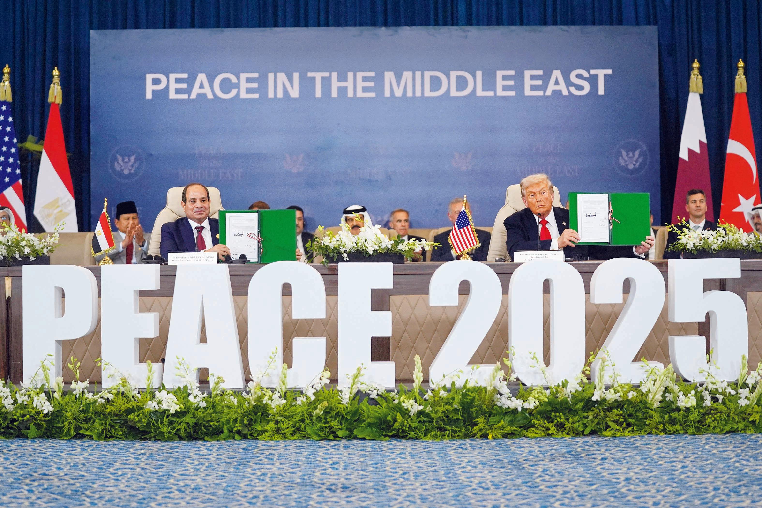 ઇઝરાયલની સંસદમાં ઐતિહાસિક ભાષણ આપીને ટ્રમ્પ ઇજિપ્ત જવા રવાના થયા હતા. ઇજિપ્તના શર્મ અલ શેખ શહેરમાં યોજાયેલા વિશાળ સંમેલનમાં અમેરિકન રાષ્ટ્રપતિ ડોનલ્ડ ટ્રમ્પે શાંતિકરાર પર હસ્તાક્ષર કર્યા હતા. ટ્રમ્પ અને ઇજિપ્તના રાષ્ટ્રપતિ અબ્દેલ ફતહ અલ-સીસીએ સાથે મળીને આ સંમેલનનું નેતૃત્વ કર્યું હતું. એમાં કતર, જૉર્ડન, ફ્રાન્સ, જર્મની, ઇન્ડોનેશિયા સહિત ૨૦થી વધુ દેશોના નેતાઓ હાજર રહ્યા હતા; પરંતુ ઇઝરાયલ કે હમાસના પ્રતિનિધિઓને બોલાવવામાં નહોતા આવ્યા.