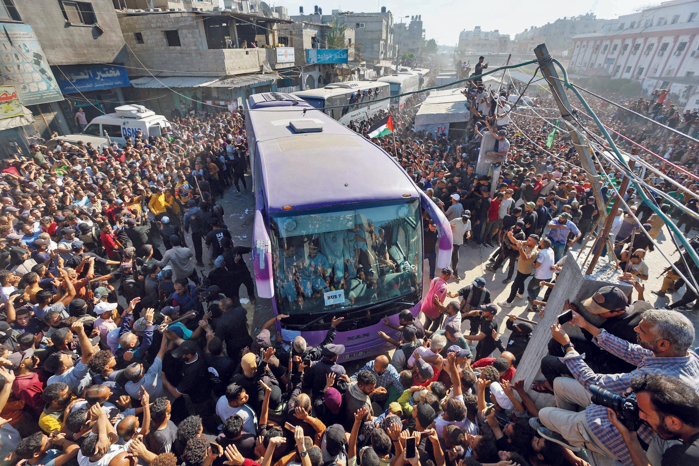 ગઈ કાલે ગાઝાના બંધકો મુક્ત થયા ત્યારે એ બસનું ભવ્ય સ્વાગત થયું હતું અને સ્વજનોને ભેટીને ખુશીથી રડી પડ્યા હતા.
