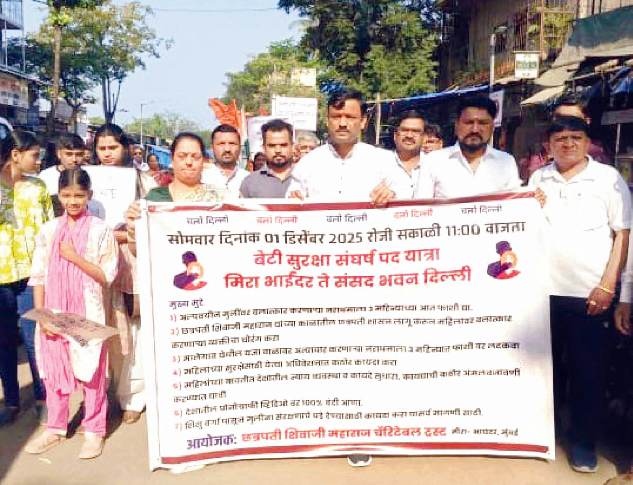 મહિલાઓની સલામતી માટે, સગીર છોકરીઓ અને મહિલાઓ પર થતા અત્યાચારની વિરુદ્ધ તથા બળાત્કાર કરનારા પુરુષો સામે સખત કાર્યવાહી કરવાની માગણી કરવા છત્રપતિ શિવાજી મહારાજ ચૅરિટેબલ ટ્રસ્ટના સ્થાપક તથા પ્રમુખ સોમનાથ બળવંત પવારે સોમવારે મીરા-ભાઈંદરથી સંસદભવન, દિલ્હી સુધી પદયાત્રા શરૂ કરી હતી.