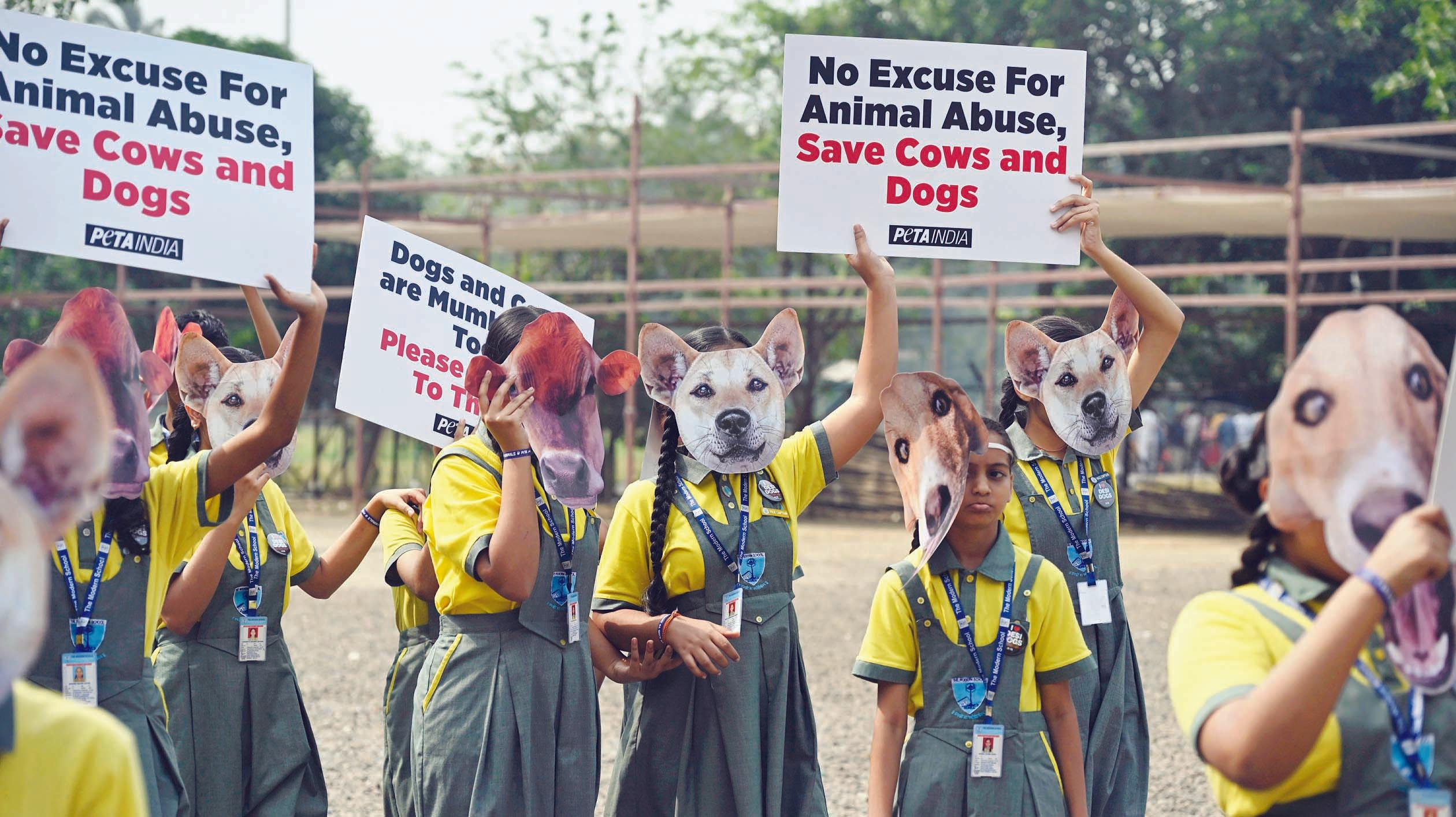 ગિરગામની ધ મૉડર્ન સ્કૂલનાં બાળકો ગઈ કાલે શ્વાન અને ગાયના માસ્ક પહેરીને આઝાદ મેદાન પહોંચ્યાં હતાં. પીપલ ફૉર ધી એથિકલ ટ્રીટમેન્ટ ઑફ ઍનિમલ્સ (PETA) દ્વારા નૅશનલ ડે ઑફ ઍક્શનની ઉજવણી કરવામાં આવી હતી. શ્વાન અને ગાયો પણ મુંબઈકર જ છે એવાં પોસ્ટર હાથમાં લઈને બાળકોએ પશુઓ પ્રત્યે દયા દાખવવાની અપીલ કરી હતી તેમ જ સુપ્રીમ કોર્ટે શ્વાનોને શેલ્ટર-હોમમાં મોકલવાનો આદેશ આપ્યો છે એને પાછો ખેંચવાની અપીલ પણ કરી હતી. તસવીર : આશિષ રાજે