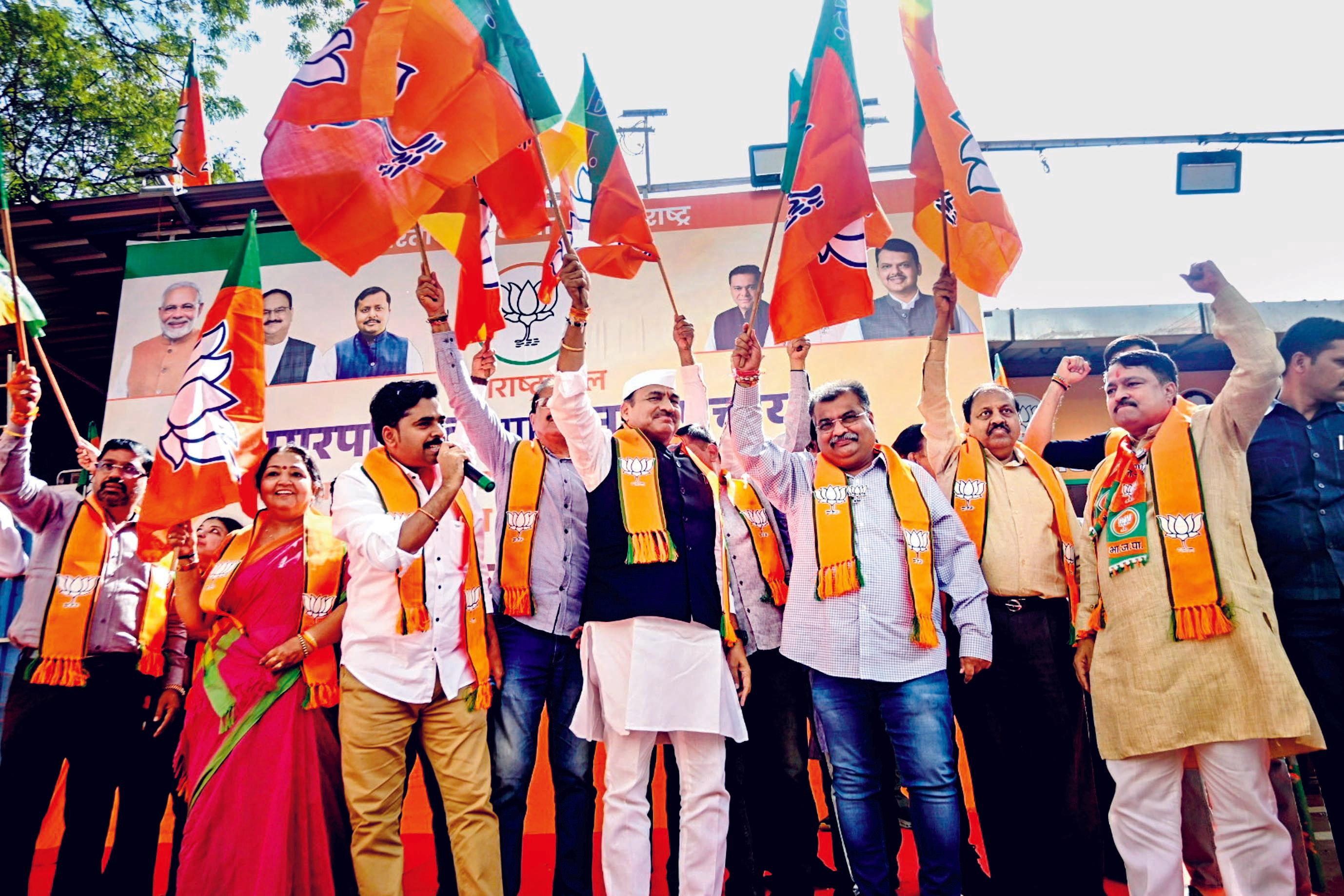ચૂંટણીમાં વિજય પાકો થઈ ગયો એ પછી હેડ ઑફિસમાં ઉજવણી કરતા BJPના રાજ્યના પ્રેસિડન્ટ રવીન્દ્ર ચવાણ અને અન્ય નેતાઓ.