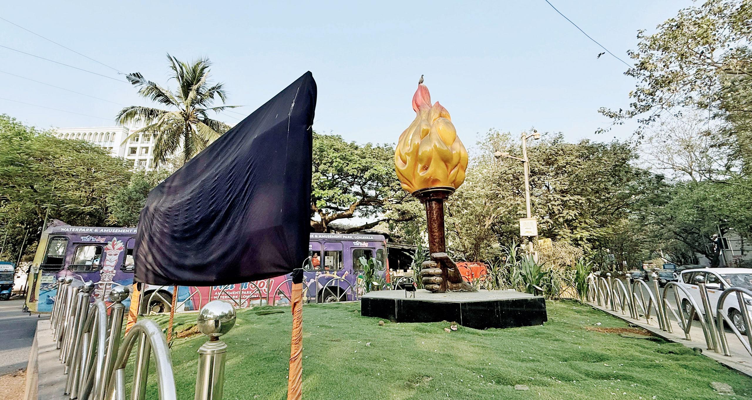 બાંદરા-ઈસ્ટમાં આવેલી કલેક્ટર ઑફિસ પાસે મશાલની પ્રતિમા આવેલી છે. આ પ્રતિમાની પાસે શિવસેના (UBT)ના સ્થાનિક વિધાનસભ્ય વરુણ સરદેસાઈ અને પદાધિકારીઓનાં નામ લખેલું બોર્ડ પણ લગાડવામાં આવ્યું છે. આચારસંહિતા અમલમાં હોવાથી ઇલેક્શન કમિશન દ્વારા જાહેર સ્થળો પરની એવી તકતીઓ અને બોર્ડ્સને ઢાંકી દેવામાં આવ્યાં છે જેમાં રાજકારણીઓનાં અને પાર્ટીનાં નામ લખ્યાં હોય. શિવસેના (UBT)નું પાર્ટી સિમ્બૉલ મશાલ છે, જેની કલેક્ટર ઑફિસ પાસેની પ્રતિમા તો ખુલ્લી હતી પણ સાથે રહેલાં નામ-વિગતો સાથેના બોર્ડને ઢાંકી દેવામાં આવ્યું હતું. તસવીરઃ નિમેશ દવે