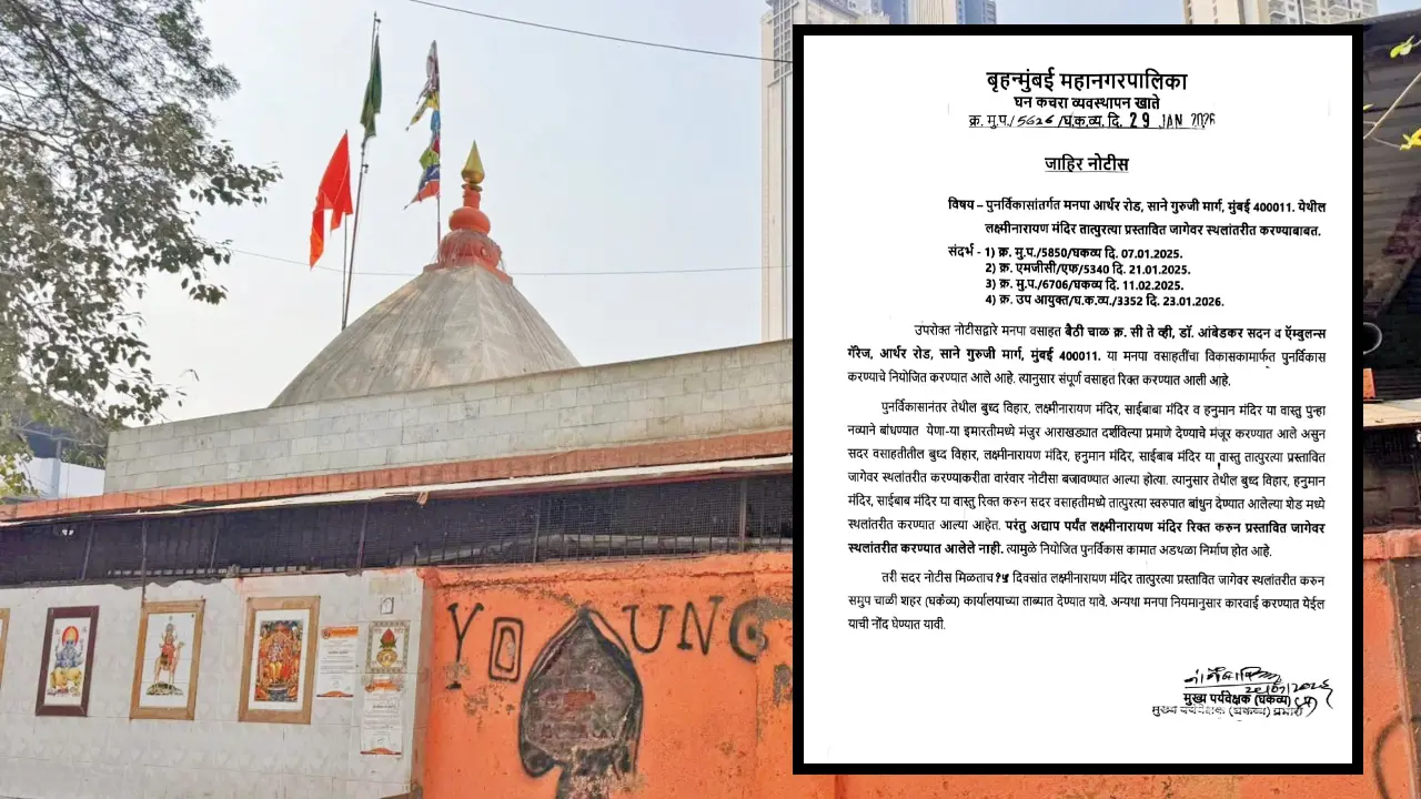 ચિંચપોકલી-વેસ્ટમાં આવેલા શ્રી લક્ષ્મીનારાયણ મંદિરને ૧૦૦થી અધિક વર્ષ થયાં હશે. એને જાન્યુઆરીના અંતમાં મહાનગરપાલિકા દ્વારા તોડવા માટેની નોટિસ આપવામાં આવી છે. ગુજરાતી સમાજે બનાવેલું પૌરાણિક એવું શ્રી લક્ષ્મીનારાયણ મંદિર સ્થાનિક લોકોની ધાર્મિક આસ્થાનું પ્રતીક છે. ૧૦૦ વર્ષથી આ લોકોએ આ મંદિરનું જતન કરીને સમાજ અને લોકોમાં ધાર્મિક આસ્થા અકબંધ રાખી છે.