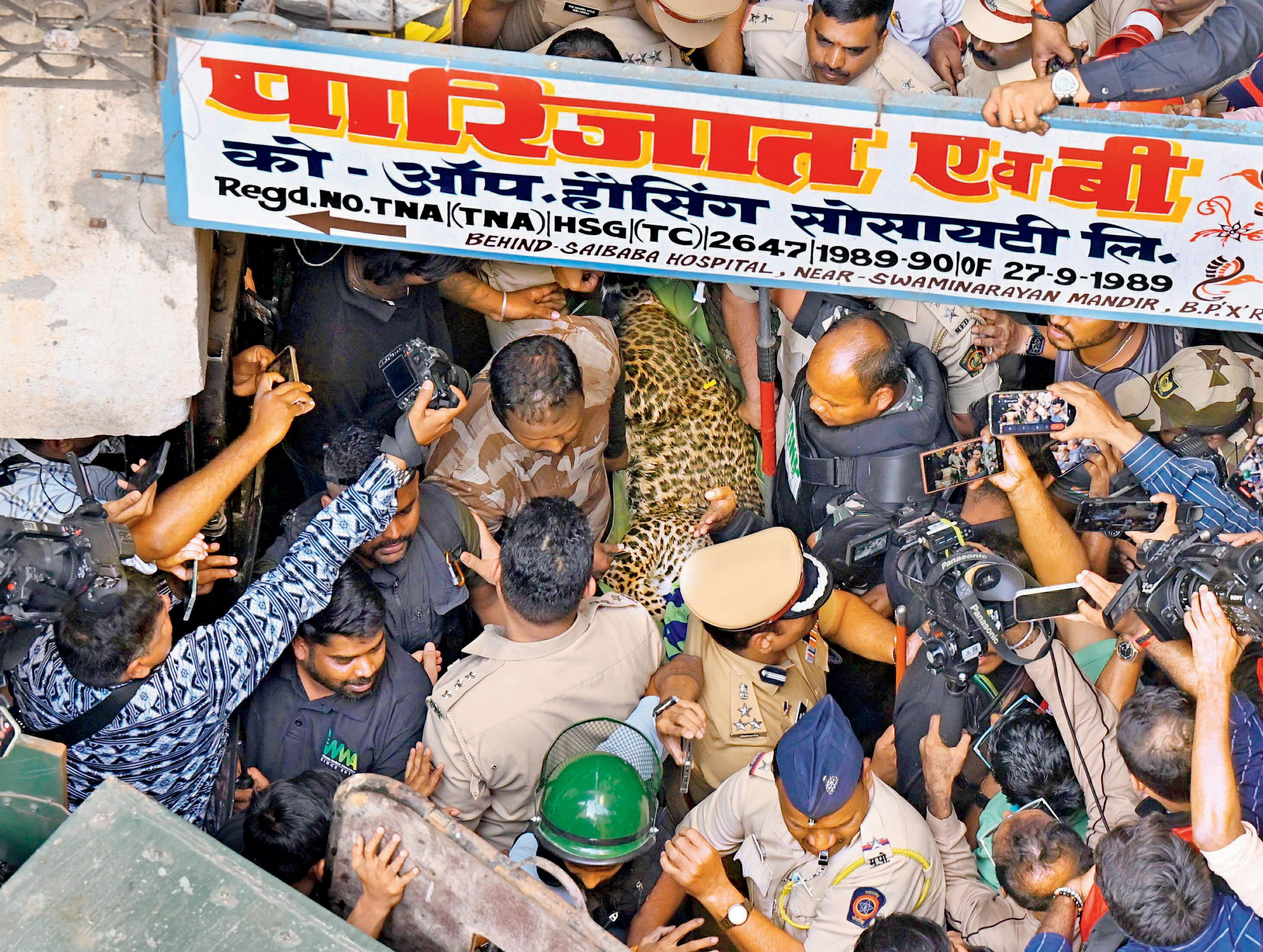 ગઈ કાલે ભાઈંદરના બિલ્ડિંગની સીડી પર અને એને બેભાન કર્યા બાદ ફૉરેસ્ટ ડિપાર્ટમેન્ટની કસ્ટડીમાં દીપડો