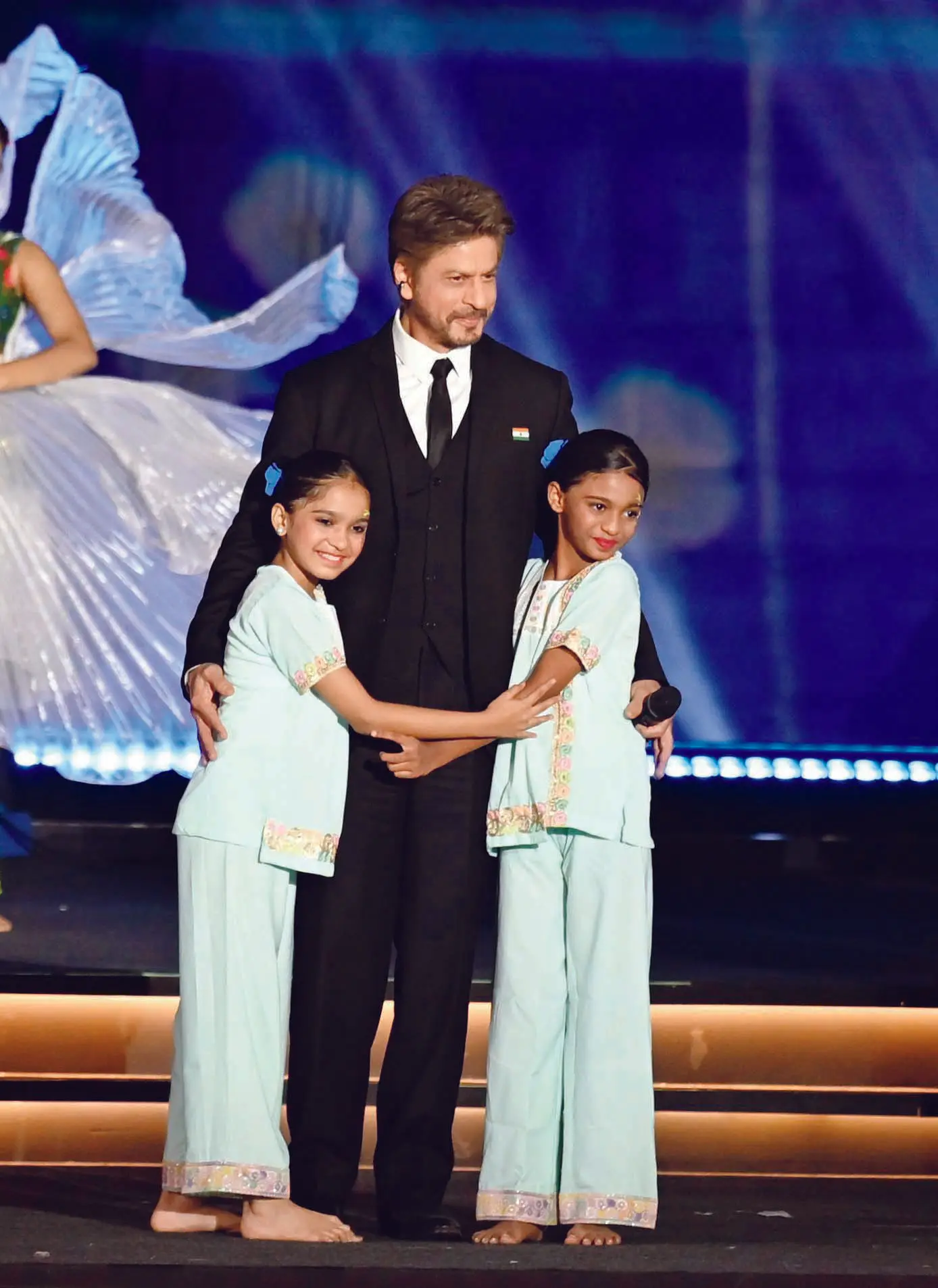 ગઈ કાલની ઇવેન્ટમાં શાહરુખ ખાનની એન્ટ્રી પણ ખૂબ સેન્ટિમેન્ટલ રહી હતી. બન્ને હાથે બે ક્યુટ બાળકીઓનો હાથ પકડીને કિંગ ખાન સ્ટેજ પર આવ્યો હતો. એ જ સમયે બૅકગ્રાઉન્ડમાં સુંદર ડાન્સ રજૂ થઈ રહ્યો હતો. સ્ટેજની વચ્ચોવચ પહોંચીને શાહરુખ ખાન નીચે ઝૂક્યો હતો. એ સમયે બન્ને બાળકીઓએ શાહરુખના ગાલે પપ્પી કરી હતી. એ પછી બૉલીવુડના બાદશાહે બન્ને બાળકીને પ્રેમથી હગ કર્યું હતું અને એક મૅજિકલ મોમેન્ટ ક્રીએટ કરી હતી જે ઇન્ટરનેટ પર છવાઈ ગઈ હતી.