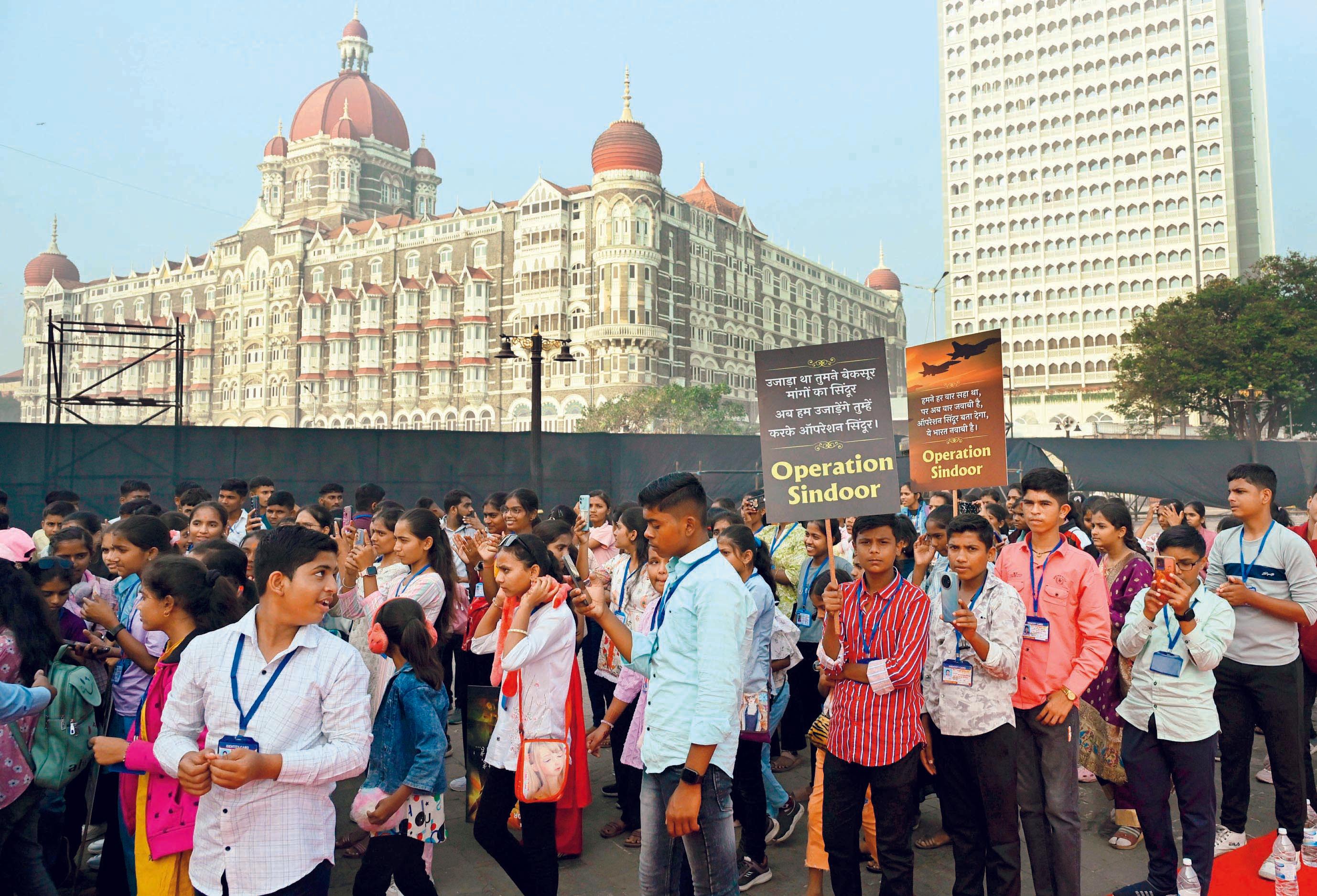મોટી સંખ્યામાં સ્કૂલ અને કૉલેજના વિદ્યાર્થીઓ ગેટવે ઑફ ઇન્ડિયા ખાતે ઑપરેશન સિંદૂરનાં પોસ્ટર લઈને આતંકવાદ વિરોધી માર્ચમાં સામેલ થયા હતા.