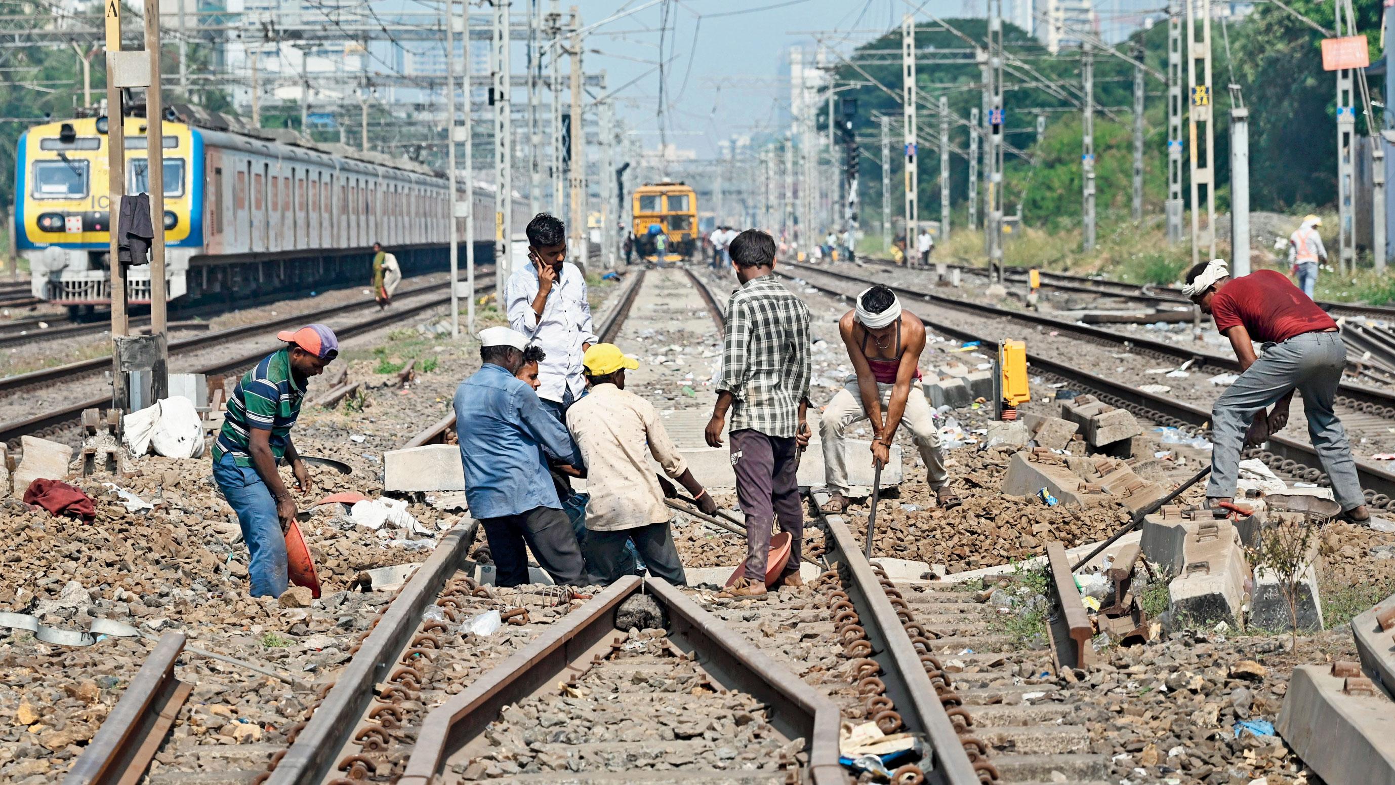 કાંદિવલી-બોરીવલી વચ્ચે છઠ્ઠી લાઇન માટેની કામગીરી યુદ્ધના ધોરણે ચાલી રહી છે. દરરોજ રાતે બ્લૉકના સમયે આ કામગીરી હાથ ધરવામાં આવે છે અને વહેલી સવાર સુધી કામ ચાલે છે. બ્લૉકના સમયે અહીંથી પસાર થઈએ ત્યારે રેલવે-ઑફિસરોની હાજરીમાં કામ કરતા કૉન્ટ્રૅક્ટ વર્કર્સ જોવા મળે છે. તસવીરો ઃ સતેજ શિંદે