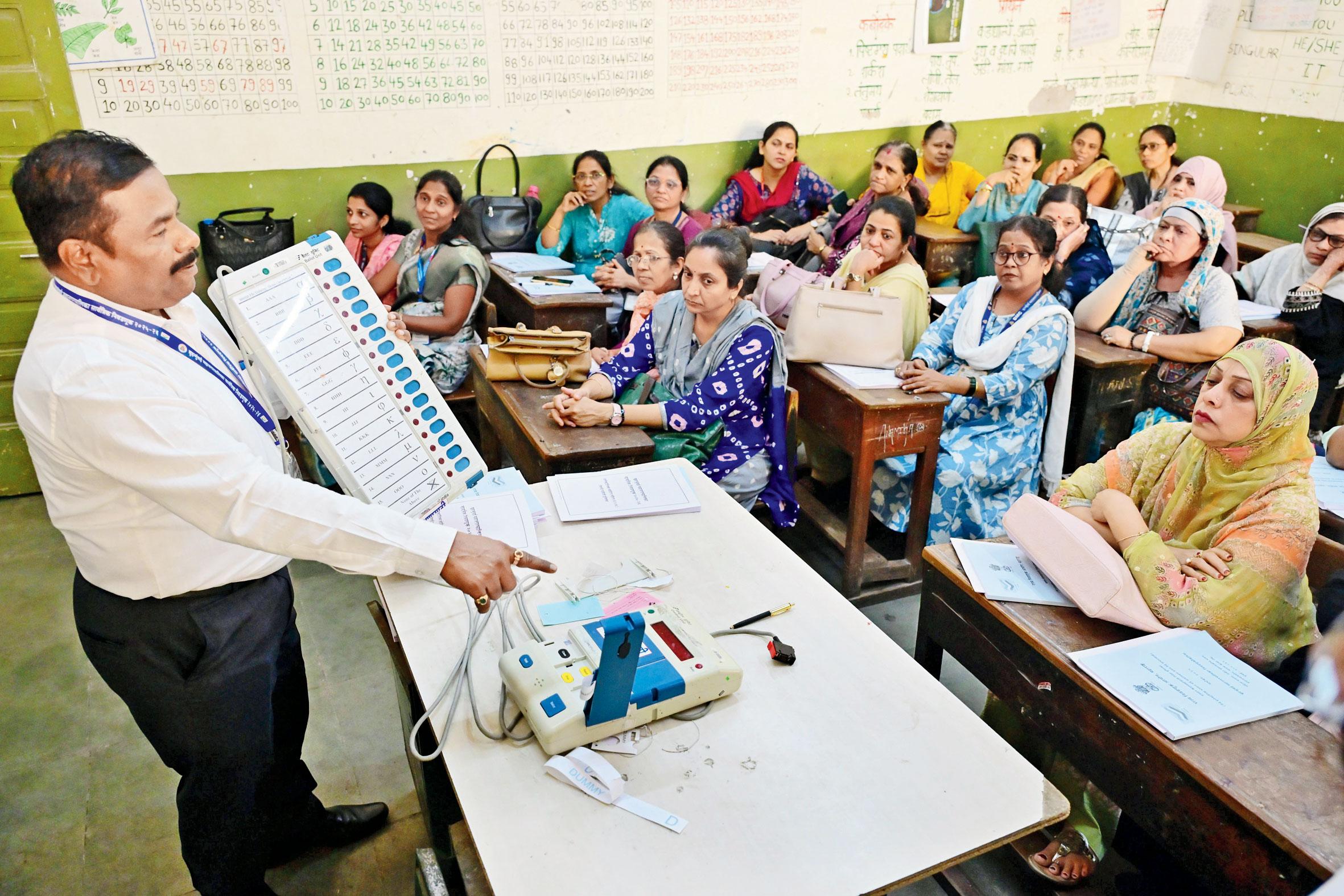 મુંબઈમાં ચૂંટણીનો અસ્સલ માહોલ જામ્યો છે. એક બાજુ ઉમેદવારો નોંધાવવાની સાથે ઝૂંટવવાની તજવીજ ચાલે છે તો બીજી બાજુ ચૂંટણીના દિવસે કોઈ કચાશ ન રહે એ માટે બૃહન્મુંબઈ મ્યુનિસિપલ કૉર્પોરેશન (BMC) પણ તડામાર તૈયારી કરી રહી છે. લોઅર પરેલના એન. એમ. જોશી માર્ગ પર આવેલી BMC સ્કૂલમાં ગઈ કાલે ઇલેક્શન સ્ટાફને ખાસ ટ્રેઇનિંગ આપવામાં આવી હતી. ઇલેક્ટ્રૉનિક વોટિંગ મશીન (EVM)ના સંચાલન બાબતે સ્ટાફને માહિતગાર કરવામાં આવ્યો હતો. તસવીર: શાદાબ ખાન