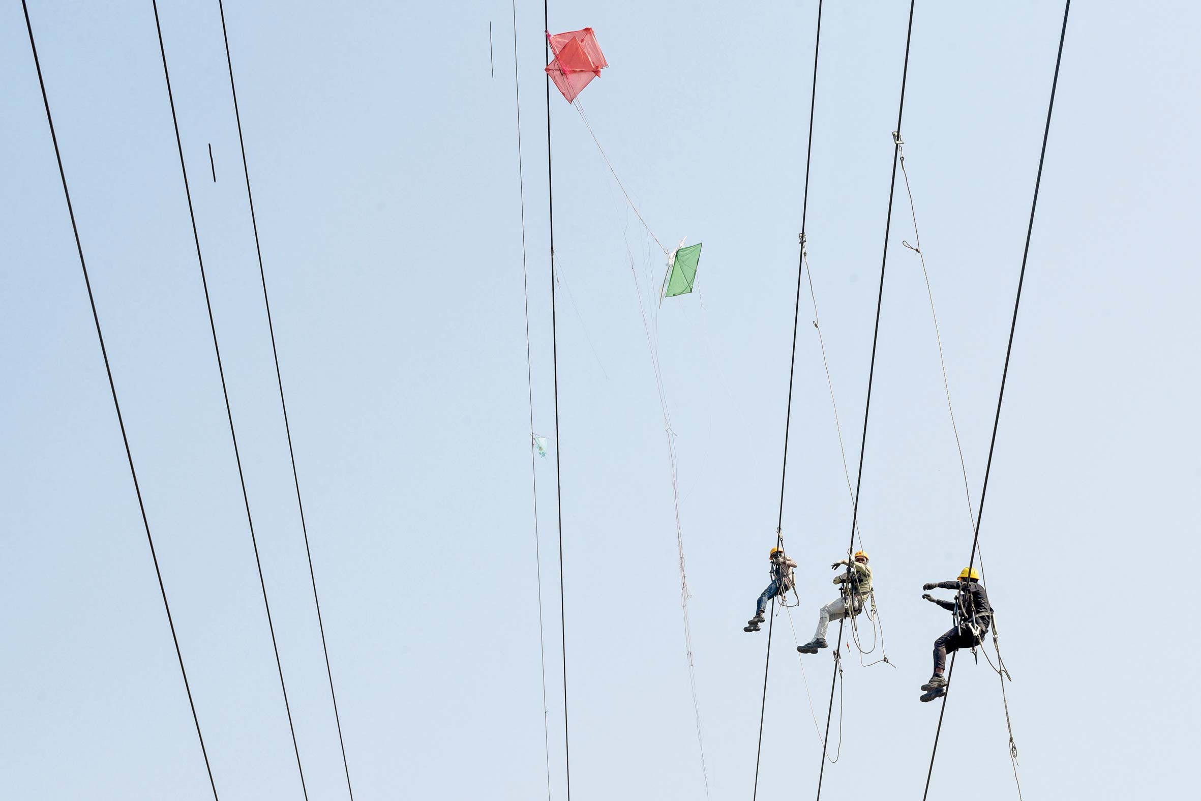 ગઈ કાલે અમદાવાદમાં એક રેસિડેન્શિયલ વિસ્તારમાં હાઈ-ટેન્શન પાવર લાઇનમાં ફસાયેલાં પતંગ અને માંજો કાઢતા કર્મચારીઓ.