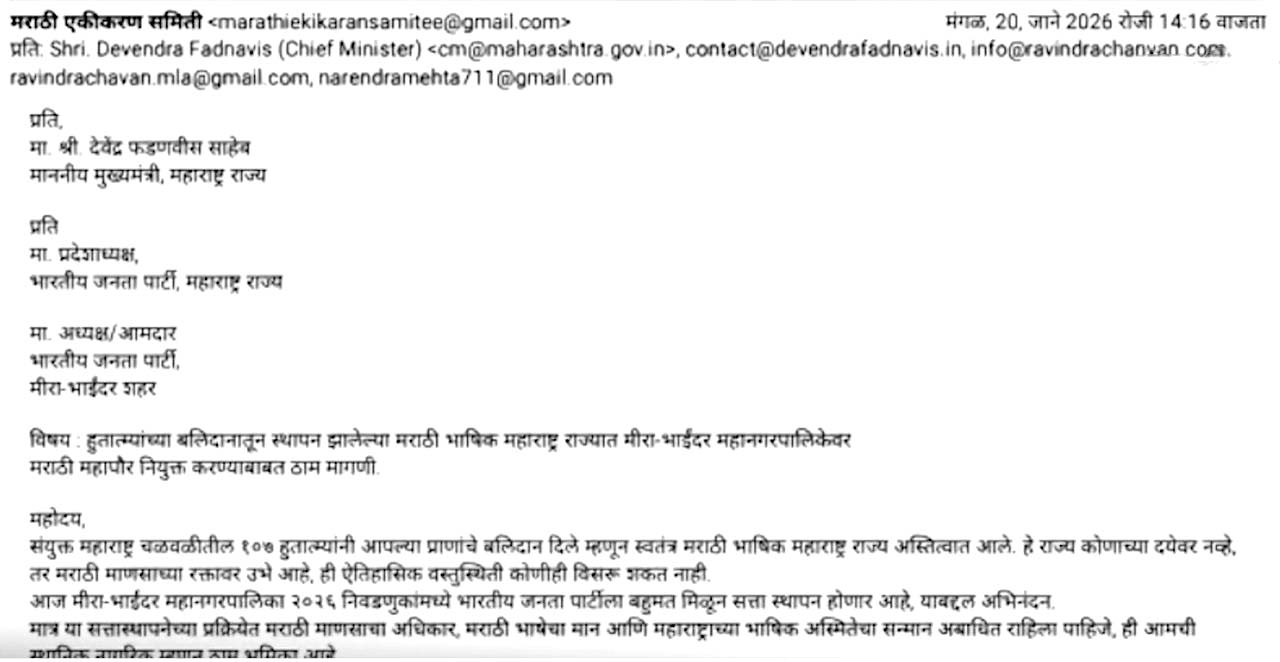 મીરા-ભાઈંદર મ્યુનિસિપલ કૉર્પોરેશન (MBMC)ના મેયરપદ માટે મરાઠી એકીકરણ સમિતિએ આક્રમક વલણ અપનાવ્યું છે. સમિતિના પ્રમુખ ગોવર્ધન દેશમુખે સીધું અલ્ટિમેટમ આપ્યું છે કે શહેરના આગામી મેયર તરીકે મરાઠીભાષી વ્યક્તિ જ હોવી જોઈએ અને જો એમનું ધાર્યું ન થાય તો આંદોલન કરવાની ચીમકી ઉચ્ચારવામાં આવી છે.