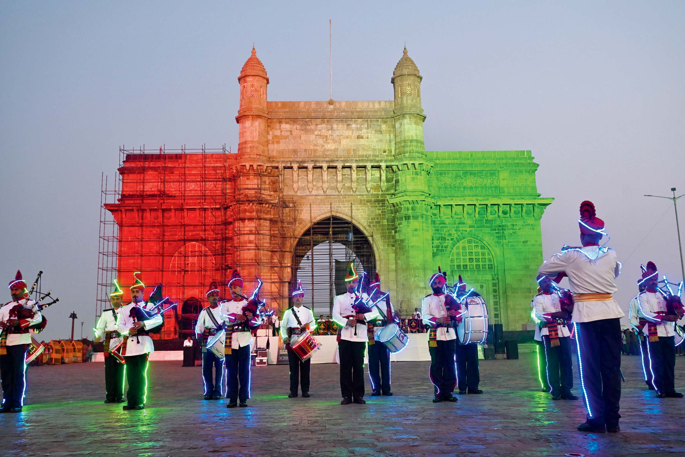 પ્રજાસત્તાક દિનની પૂર્વસંધ્યાએ ગેટવે ઑફ ઇન્ડિયાને તિરંગાની લાઇટિંગથી રોશન કરવામાં આવ્યો હતો. આઝાદીની લડત અને ‘વંદે માતરમ’ને થયેલાં ૧૫૦ વર્ષના સ્મરણાર્થે સૈન્યની આર્ટિલરી સેન્ટર બ્રાસ ઍન્ડ પાઇપ બૅન્ડ અને MG&G ગેરિસન બટૅલ્યન પાઇપ બૅન્ડે દેશની આઝાદી પર દેશભક્તિનાં ગીતોની સુંદર રજૂઆત કરી હતી. તસવીર : અતુલ કાંબલે