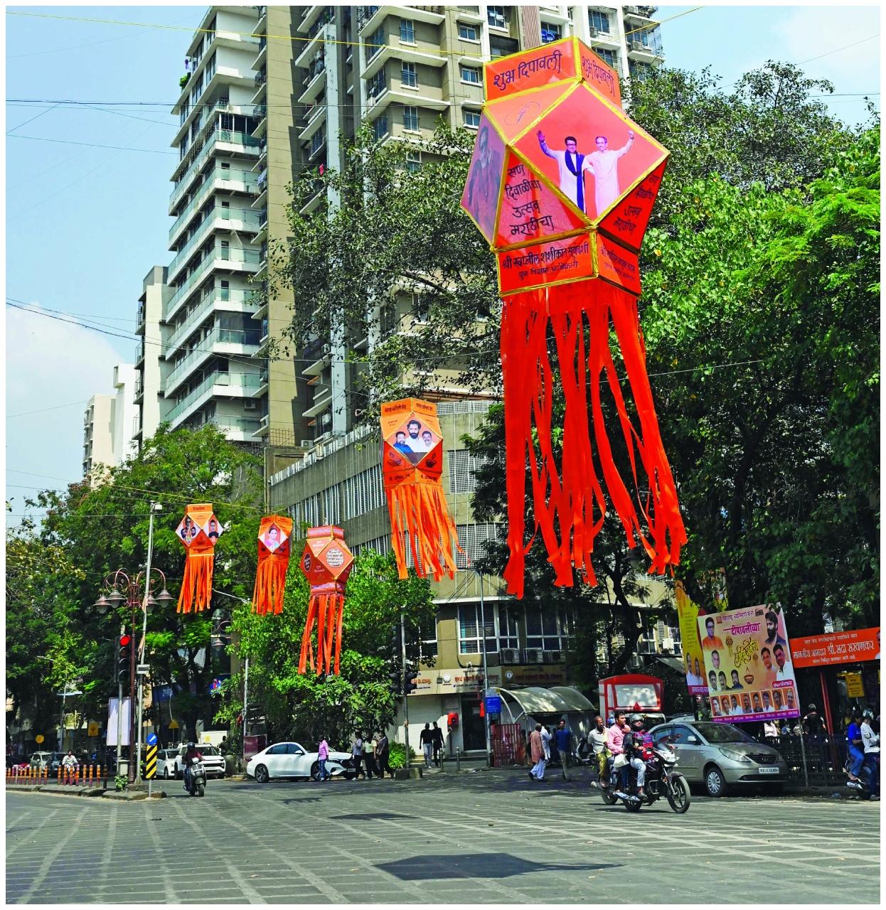 મહારાષ્ટ્ર નવનિર્માણ સેનાના ચીફ રાજ ઠાકરે અને ઉદ્ધવ ઠાકરેને એકસાથે ચમકાવતાં કંદીલ પ્રભાદેવીમાં મહારાષ્ટ્ર નવનિર્માણ સેનાની યુવા પાંખે શૈતાન ચોકી પાસે લગાડ્યાં હતાં. એટલું જ નહીં, બીજા કંદીલમાં ઉદ્ધવ ઠાકરેના પુત્ર આદિત્ય ઠાકરે અને રાજ ઠાકરેના પુત્ર અમિત ઠાકરેને પણ દર્શાવવામાં આવ્યા છે. એ બન્ને ઠાકરે બંધુઓના રાજકીય પક્ષોની બૃહન્મુંબઈ મ્યુનિસિપલ કૉર્પોરેશનની ચૂંટણી પહેલાં યુતિ થશે એવી આશા દર્શાવી રહ્યાં છે. તસવીર : આશિષ રાજે