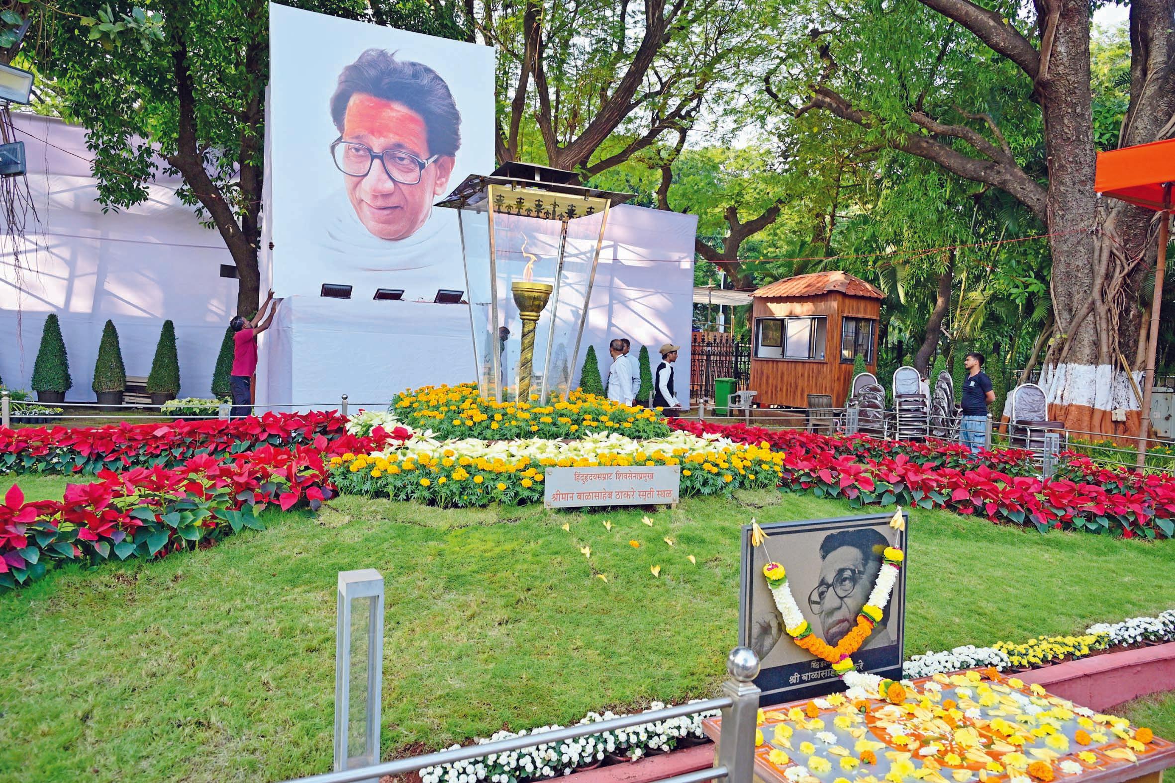 આજે બાળાસાહેબ ઠાકરેની ૧૩મી પુણ્યતિથિ છે, જે માટેના કાર્યક્રમ માટે શિવાજી પાર્કમાં ગઈ કાલે તૈયારીઓ ચાલી રહી હતી. તસવીર: શાદાબ ખાન
