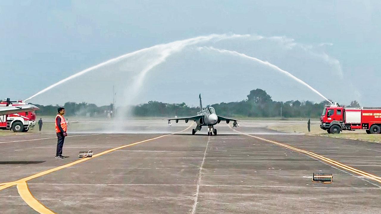 પહેલા સફળ ટેસ્ટ પરીક્ષણ પછી તેજસ ફાઇટર જેટને વૉટર-કૅનનથી સન્માન અપાયું હતું