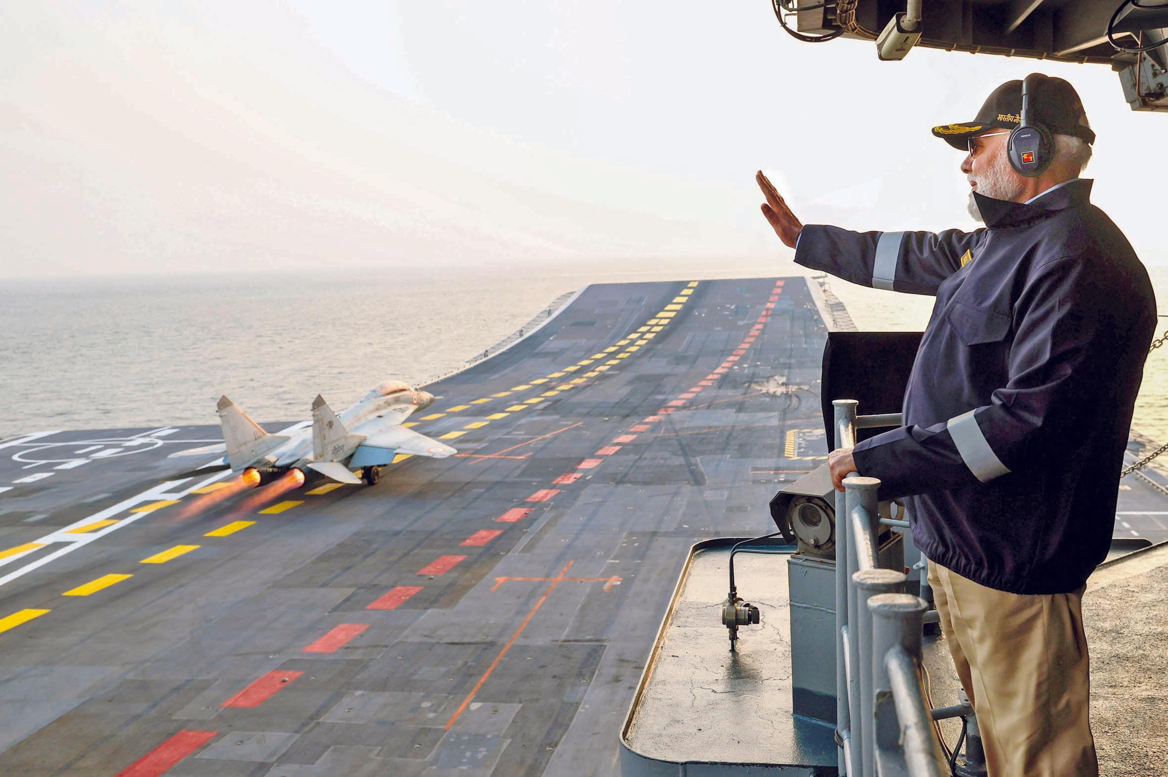 INS વિક્રાન્ત પરથી મિગ-29ને ટેક-ઑફ કરતું જોઈ રહેલા નરેન્દ્ર મોદી.
