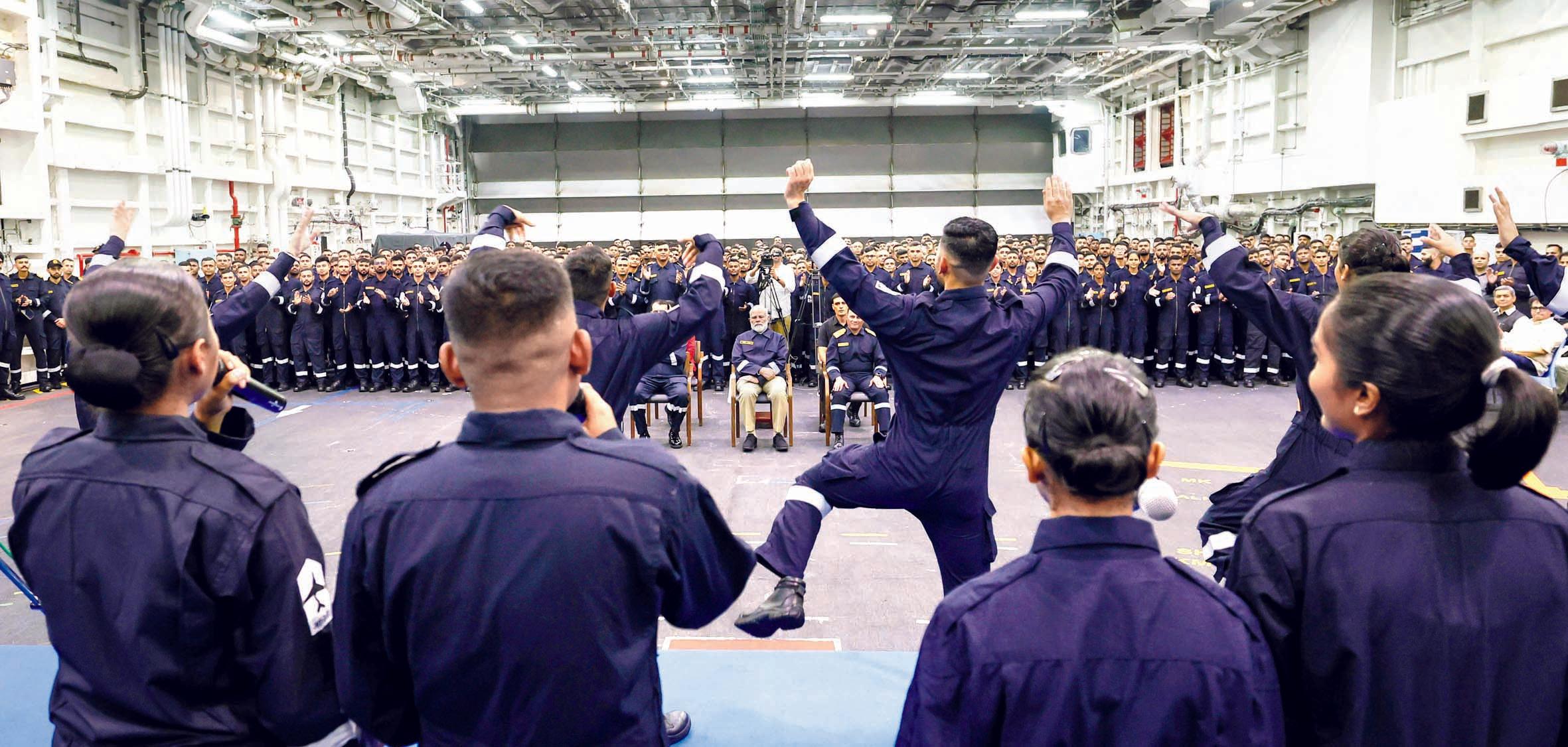 આકાશમાં હવાઈ કરતબના કાર્યક્રમ બાદ નરેન્દ્ર મોદીએ જવાનોને દિવાળીની મીઠાઈ ખવડાવી હતી અને નૌસેનાના જવાનો સાથે વાતચીત કર્યા પછી જવાનોએ દેશભક્તિનાં ગીતો ગાયાં હતાં જેમાં નરેન્દ્ર મોદી તાલ આપતા જોવા મળ્યા હતા. દિવાળીની ઉજવણી પછી વડા પ્રધાને નૌસેનાને સંબોધન કર્યું હતું. એમાં ૪૫ મિનિટનું ભાષણ આપ્યું હતું જેમાં INS વિક્રાન્તની ઑપરેશન સિંદૂરમાંની ભૂમિકાનાં વખાણ કર્યાં હતાં. તેમણે કહ્યું હતું કે ‘હું આપણી સેનાઓને ખાસ સૅલ્યુટ કરવા માગું છું. ત્રણેય સેનાઓના જબરદસ્ત સમન્વયથી ઑપરેશન સિંદૂરમાં પાકિસ્તાન ઘૂંટણિયે પડવા મજબૂર બન્યું હતું.’