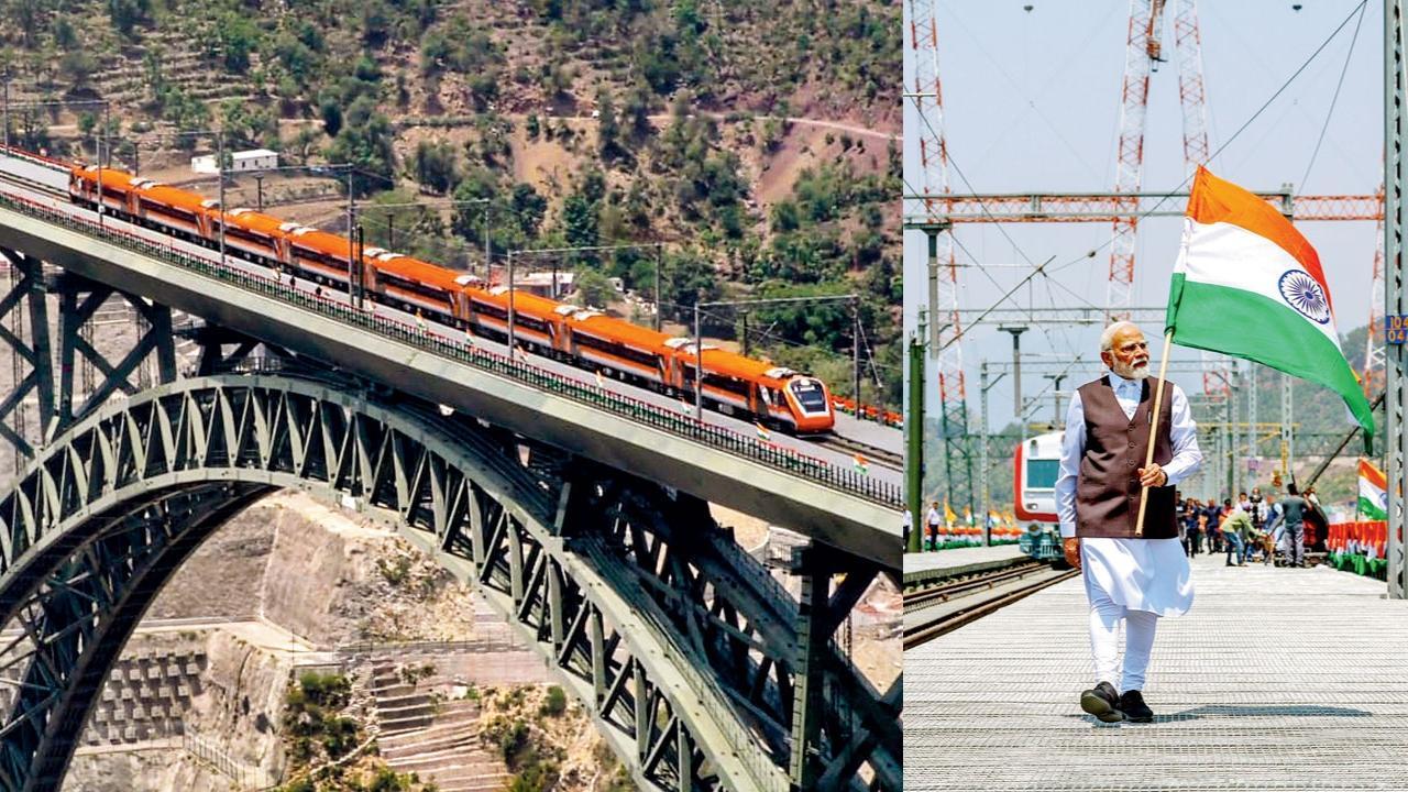 ગઈ કાલે ચેનાબ બ્રિજ પર તિરંગા સાથે નરેન્દ્ર મોદી અને એના પરથી પસાર થતી વંદે ભારત એક્સપ્રેસ