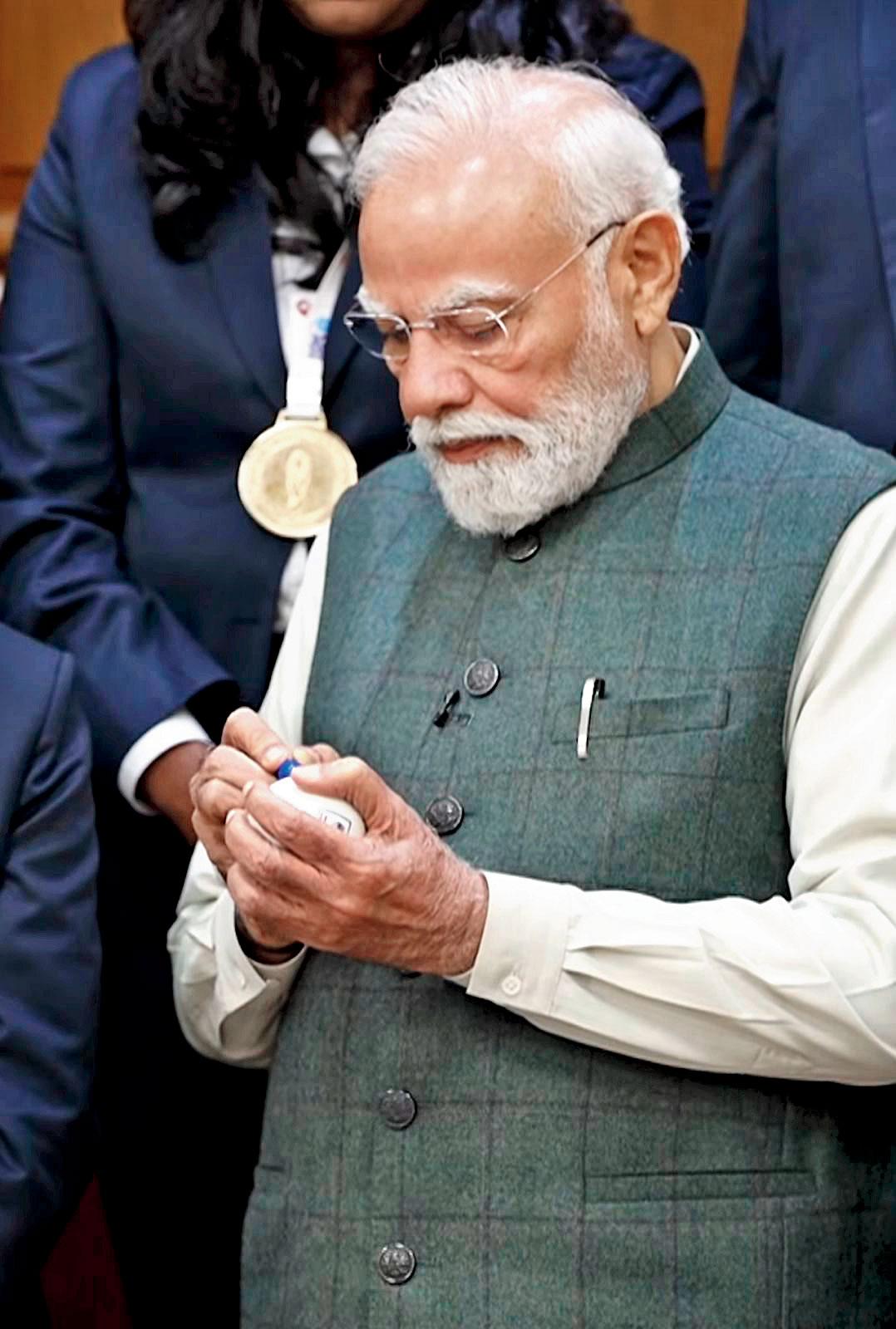 સતત ત્રીજી વખત નરેન્દ્ર મોદીએ ક્રિકેટ ટુર્નામેન્ટની ટ્રોફીને સ્પર્શ કર્યો નહોતો. બ્લાઇન્ડ વિમેન્સ વર્લ્ડ કપની ટ્રોફી પણ વડા પ્રધાને પ્લેયર્સને હાથમાં પકડાવીને જ ગ્રુપ-ફોટો પડાવ્યો હતો. આ પહેલાં મેન્સ T20 વર્લ્ડ કપ 2024 અને વિમેન્સ વન-ડે વર્લ્ડ કપ 2025ની વિજેતા ભારતીય ટીમ સાથેની મુલાકાત દરમ્યાન પણ ચૅમ્પિયન્સના હકની ટ્રોફીને અડકી નહોતી.