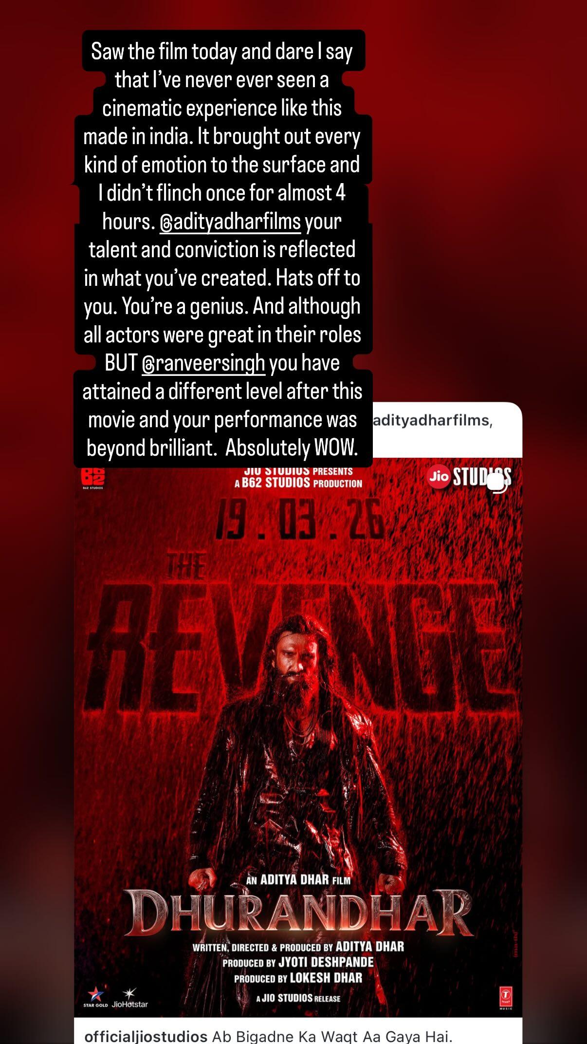 `ધુરંધર : ધ રિવેન્જ` ફિલ્મ જોયા પછી વિરાટ કોહલીએ ઇન્સ્ટાગ્રામ સ્ટોરી પોસ્ટ કરી છે. જેમાં તેણે લખ્યું છે કે, તેણે ક્યારેય ભારતીય પ્રોડક્શનમાં આવી ફિલ્મનું નિર્માણ જોયું નથી. તેણે શેર કર્યું કે લગભગ ચાર કલાક લાંબી આ ફિલ્મે તેની અંદરની દરેક ભાવનાઓને ઉત્તેજિત કરી દીધી, અને તે આખી ફિલ્મ દરમિયાન એક ક્ષણ માટે પણ આંખ મીંચી શક્યો નહીં.